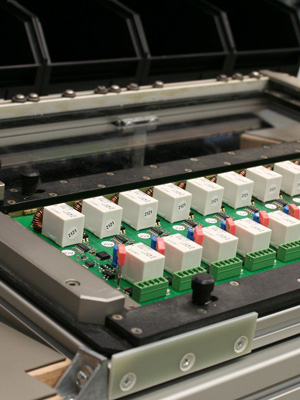 In conventional assembly, THT components are assembled on assembly tables in the printed circuit boards directly in the soldering frame. The in-line transport system conveys the solder frames via the ERSA Powerflow N² solder wave system, with which the THT components are soldered in a lead-free process, and back to the respective assembly stations.