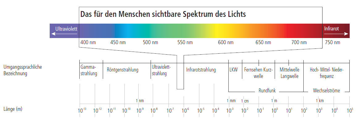 For better understanding, light can be defined as an electromagnetic wave. The human eye can only perceive the electromagnetic waves that are in the so-called visible range. In addition, there are other waves of other frequencies that are not visible to the eye as color. These waves are named to explain what they are used for. The entire electromagnetic spectrum ranges from radio waves, which are among the lowest energy long waves, to X-rays and the gamma rays of atomic nuclei, which are among the most energy-rich. On the contrary, the visible area is only a small part of this spectrum. The value is between about 380 nm (violet) and 780 nm (red).