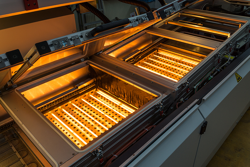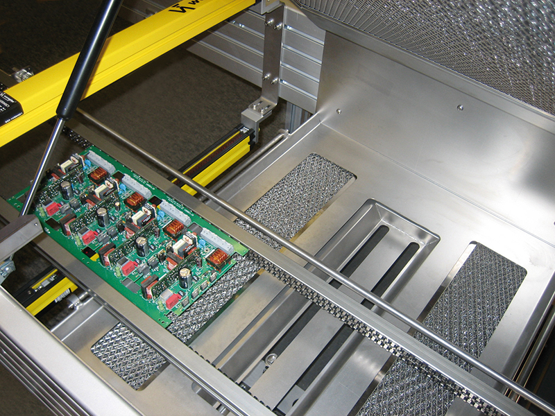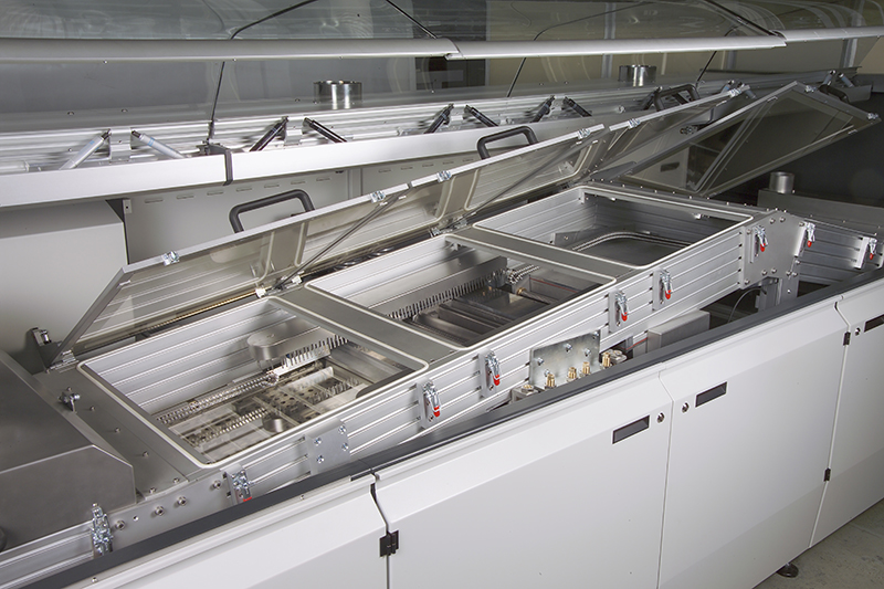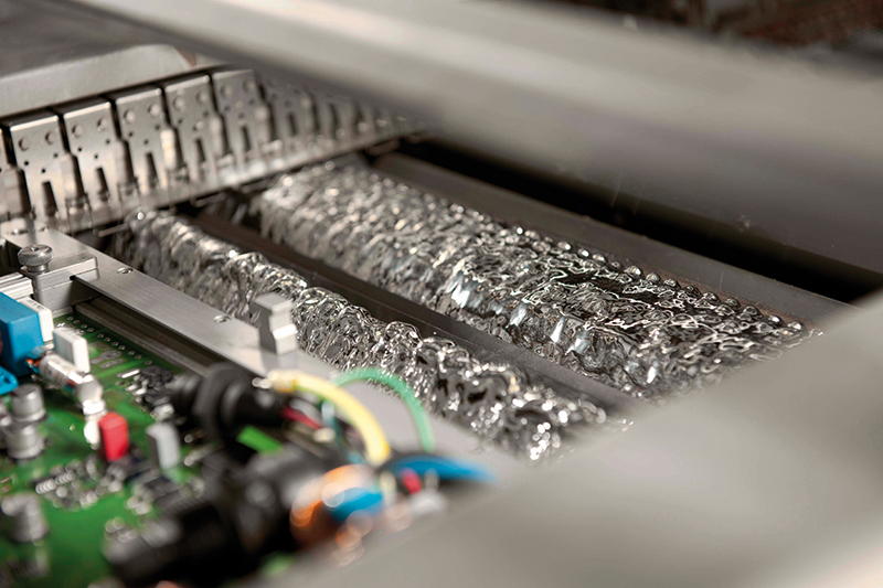 Mit der Volltunnel-Wellenlötanlage werden die THT-Bauteile in einer Stickstoffumgebung über eine Lötwelle auf der Unterseite der Leiterplatte verlötet. Die geregelte Stickstoffumgebung unterstützt dabei qualitativ die Verlötung.