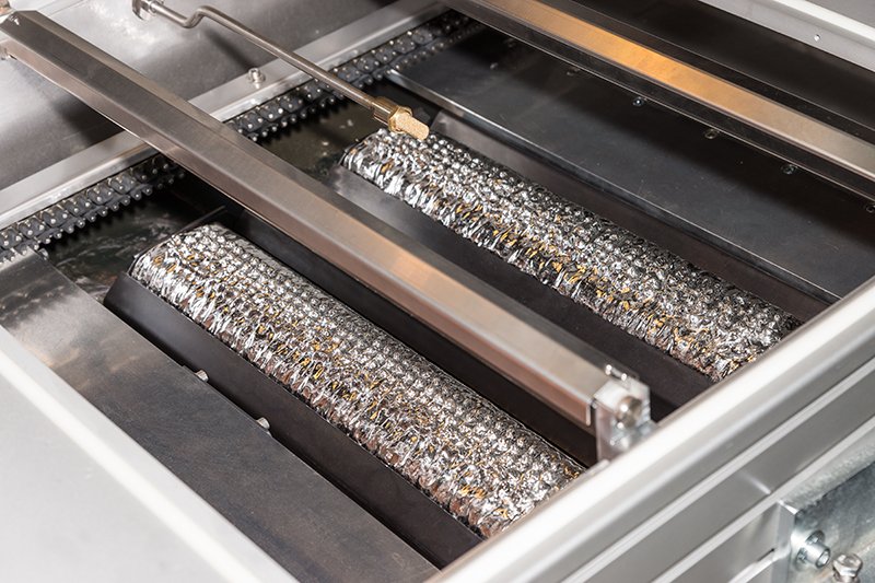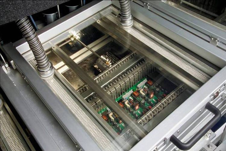 Eine Ultraschalldüse trägt das Flussmittel exakt auf und auch der Lötzinnpegel wird durch eine automatisierte Regelung exakt eingehalten. So wird sichergestellt, dass die Löthöhe an der Düse immer konstant ist.